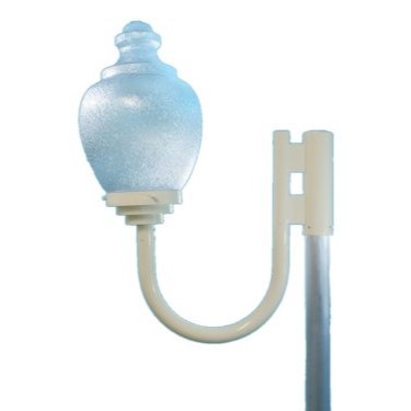 Polycarbonate acorn lamp for outdoor use on a heavy-gauge “J” gooseneck made from 1.5″ schedule-40 pipe, with an offset canopy sized for 3″ diameter poles. UL Listed.