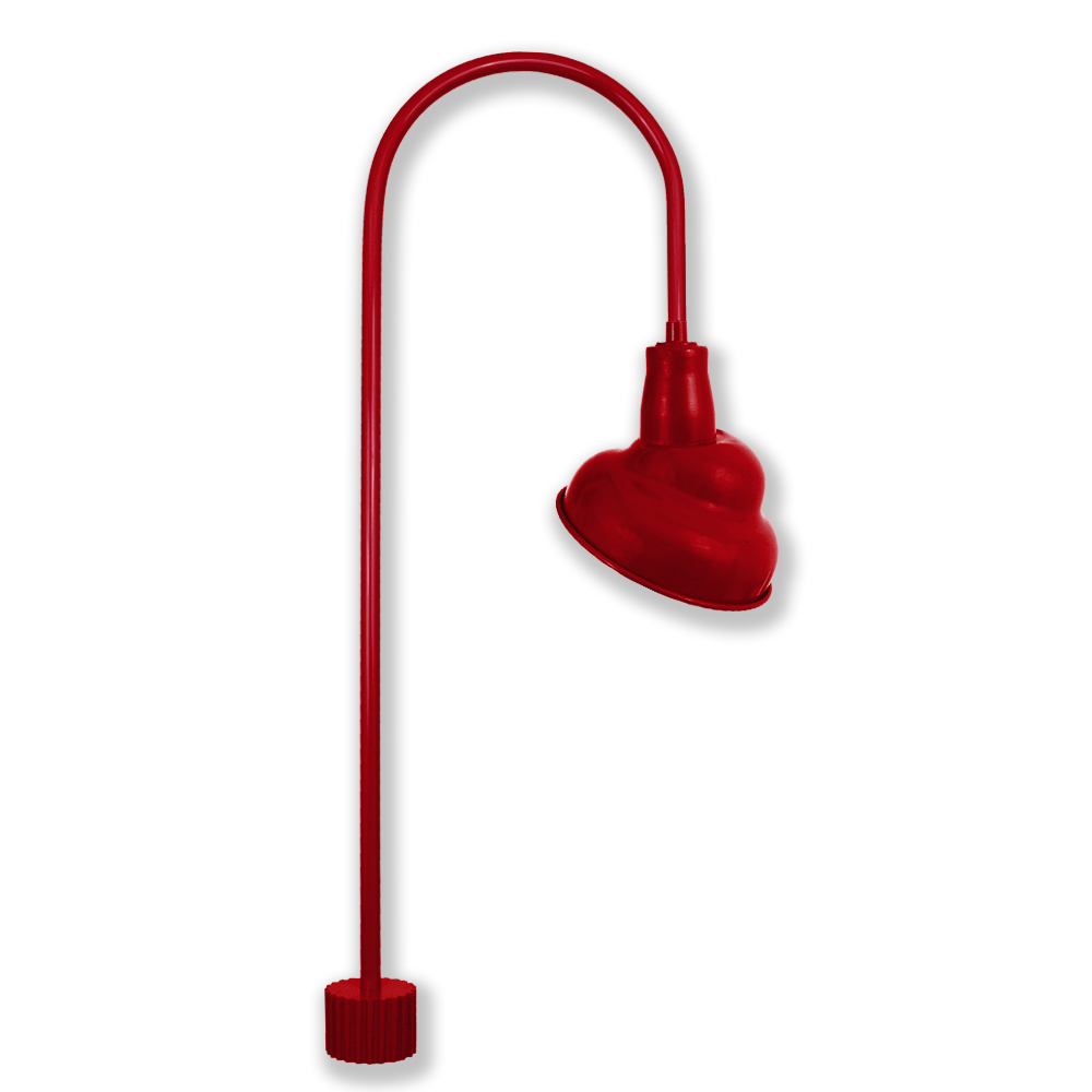 “Emblem” all-aluminum shade for exterior use on a J-shaped 1/2″ IPS schedule-40 arm, mounted to a base fitted for 3″ diameter posts. UL Listed.