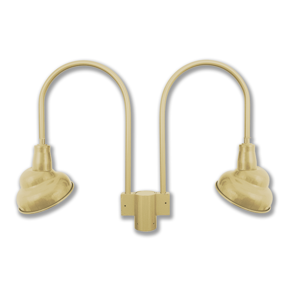Two “Emblem” all-aluminum shades for outdoor use on double small J-shaped 1/2″ IPS schedule-40 arms, mounted to a base fitted for 3″ diameter posts. UL Listed.