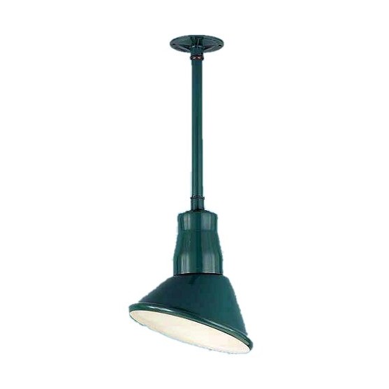 Durable all-aluminum angled shade designed for exterior installation on an 18″ long, 7/8″ diameter ceiling-mount stem. UL Listed for safety and reliability.