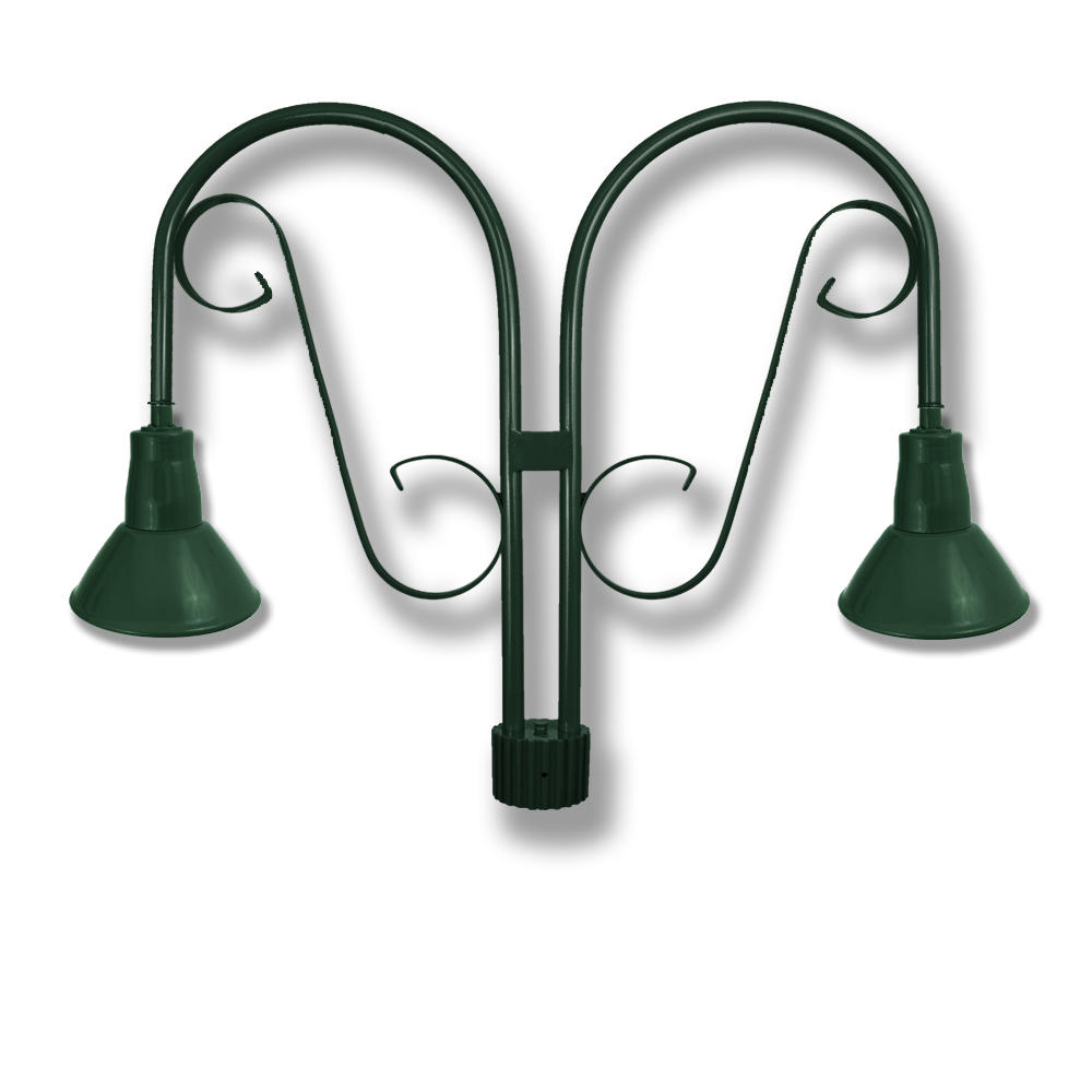 Two down all-aluminum shade head for exterior installation on a double J-shaped 1/2″ IPS schedule 40 aluminum arm with a decorative scroll attached to a mount fitted for 3″ diameter posts. UL Listed.