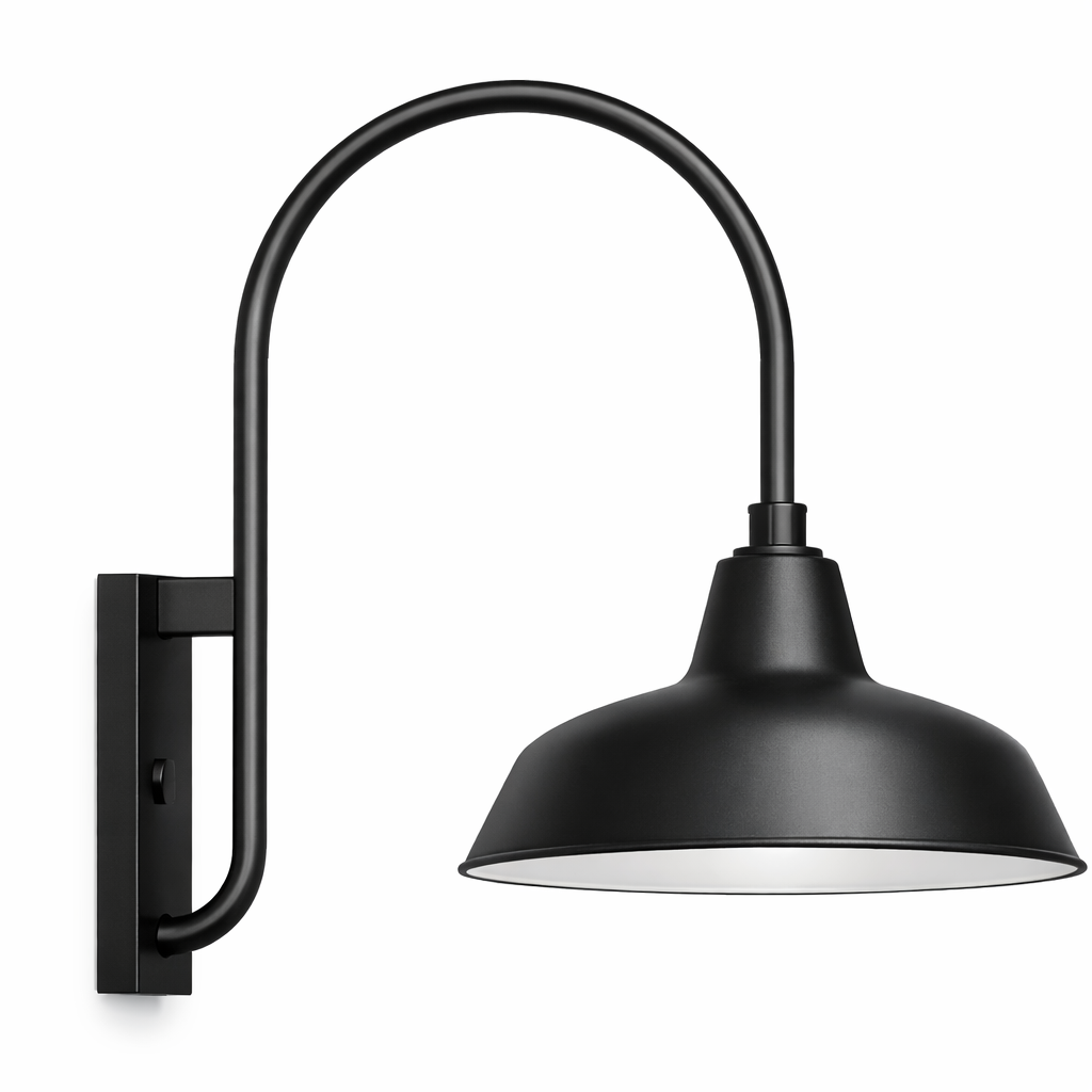 This classic, commercial-grade gooseneck wall fixture pairs a 16″ aluminum shade with a 25″ extension arm to deliver focused downlight where you need it most. Ideal for entries, barns, garages, storefronts, and signage. Select an E26 socket rated up to 200W, or choose a high-output integrated LED option in 12W or 22W for efficient, long-lasting performance.