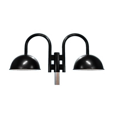 Double dome shades for outdoor use on heavy-gauge “J” gooseneck arms made from 1.5″ schedule-40 pipe, attached to offset mounts for 3″ poles. UL Listed.