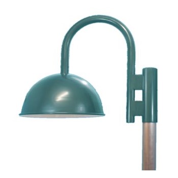 Dome shade for exterior use on a heavy-gauge “J” gooseneck made from 1.5″ schedule-40 pipe, with an offset mount sized for 3″ poles. UL Listed.